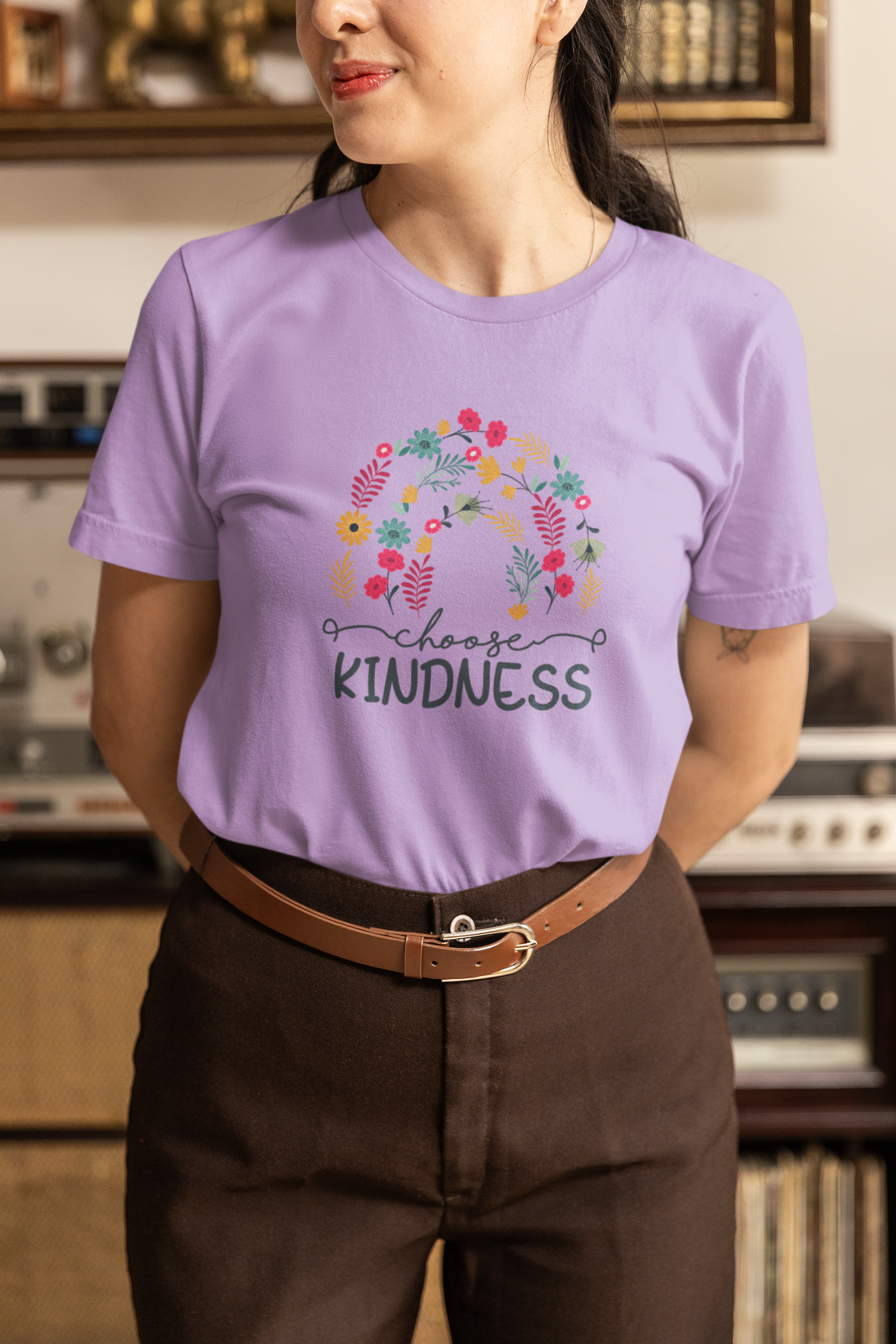 Let your outfit speak for your values with this beautifully designed women’s regular fit t-shirt. Featuring the heartwarming message “Choose Kindness” and vibrant flower stem graphics, this tee blends comfort with a purpose. Made from soft, breathable 100% cotton, it ensures all-day ease while promoting a message of compassion and positivity. The colorful floral design adds a cheerful touch, making it ideal for casual outings, daily errands, or relaxed weekends. Pair it with jeans, shorts, or leggings for an effortlessly kind and stylish look.
